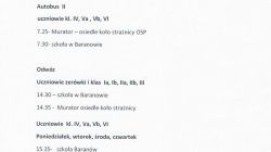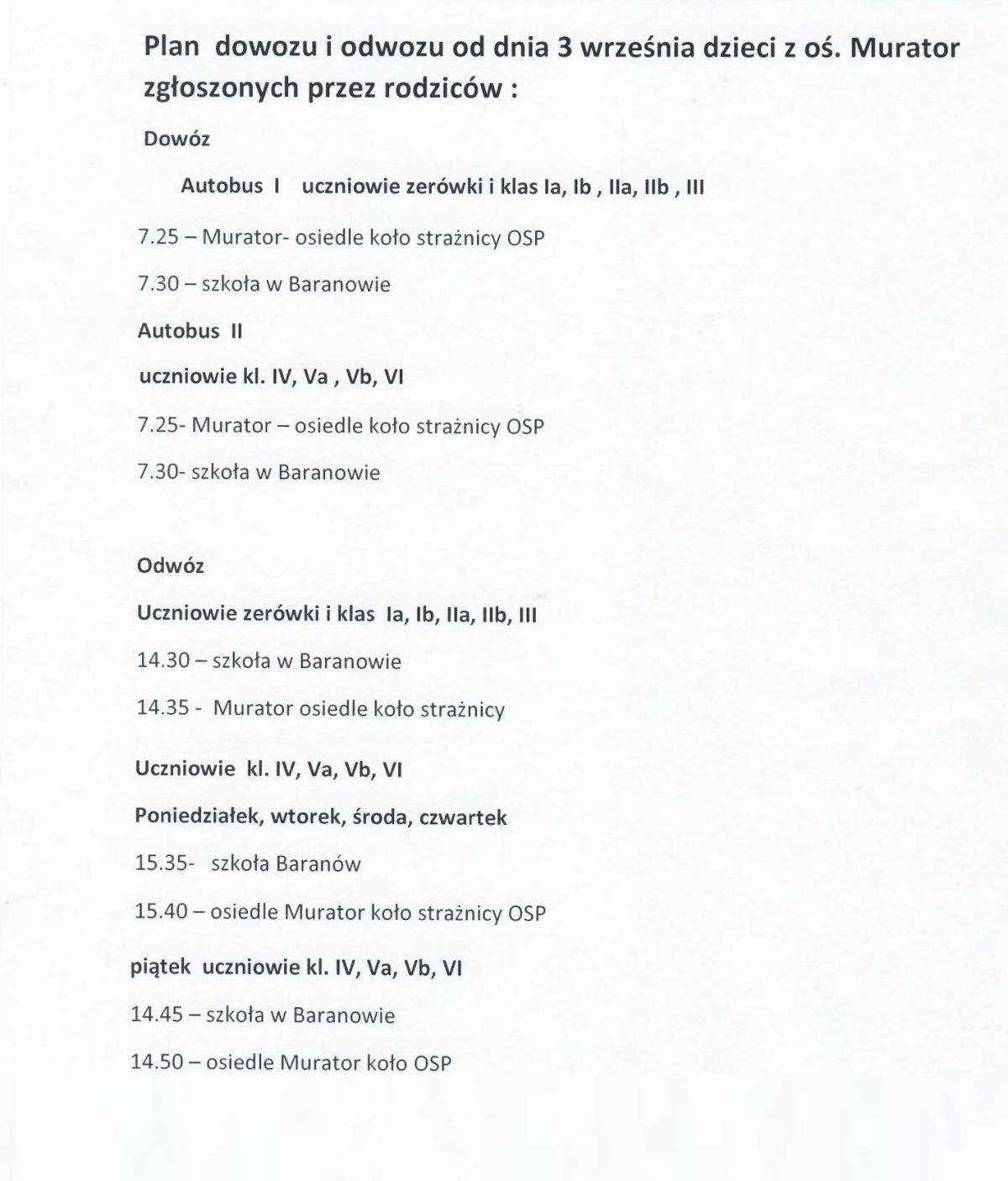 Uczniowie klas 0-III oraz klas IV-VI będą dowożeni osobnymi autobusami o różnych godzinach. W tym roku punkt rannej zbiórki i popołudniowego odbioru dzieci jest tylko pod strażnicą OSP na osiedlu Murator. Autobusem jeżdżą tylko zgłoszone szkole dzieci.