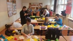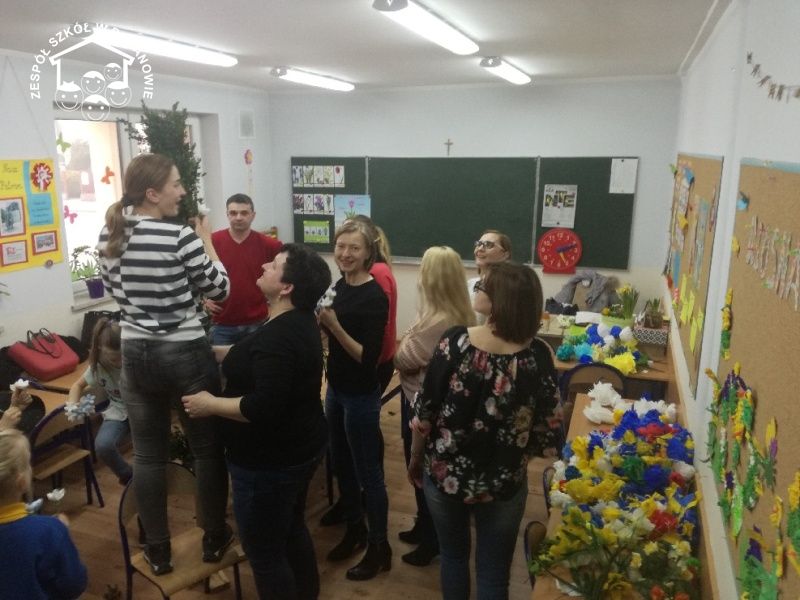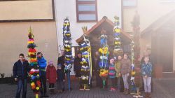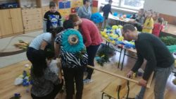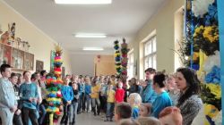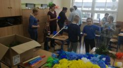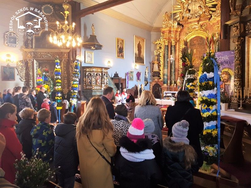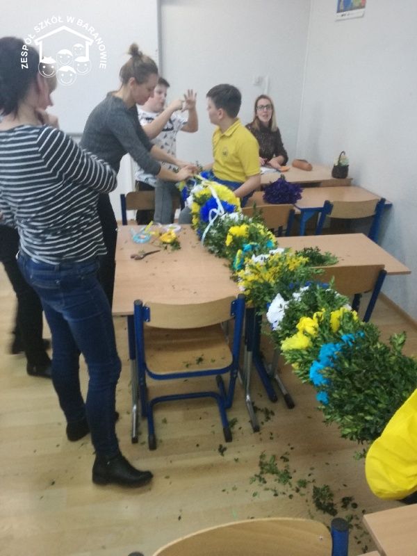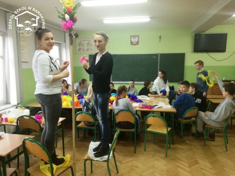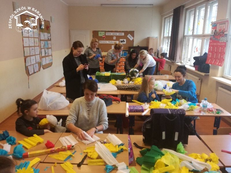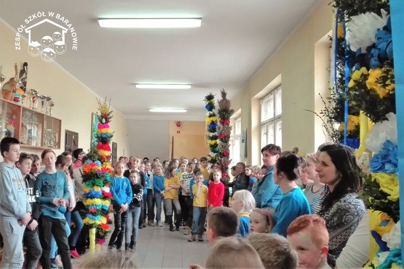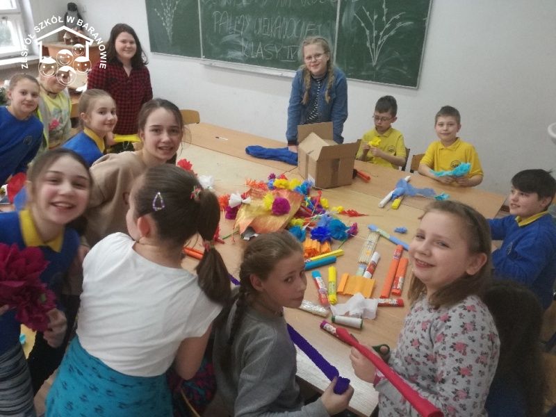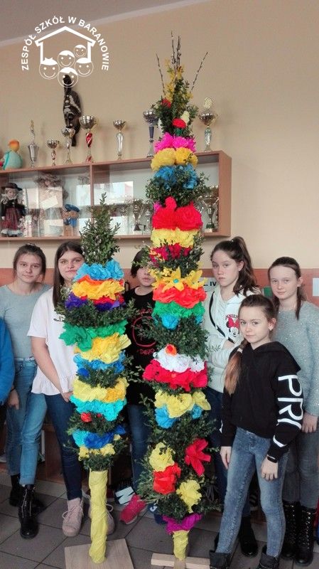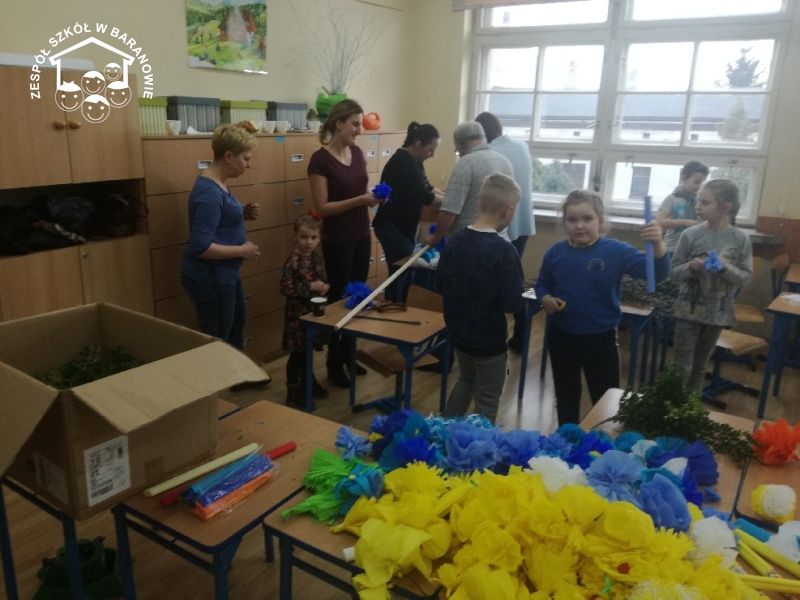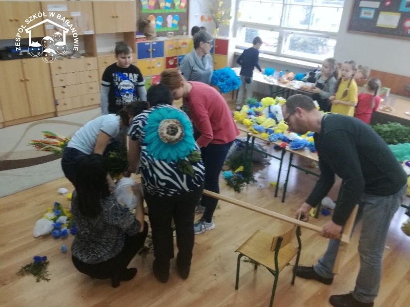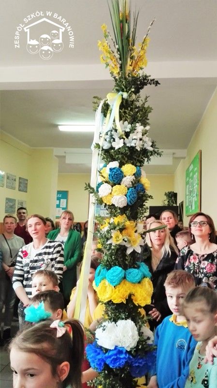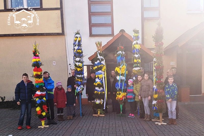 Już ponad 10 lat trwa nasza piękna tradycja przygotowywania palm wielkanocnych. W miniony czwartek po raz kolejny spotkaliśmy się w godzinach popołudniowych z uczniami i rodzicami, aby wspólnie te „Panny Wielkanocne” stworzyć. W ten sposób upamiętniamy i kontynuujemy tę piękną polską tradycję. Wspólna praca ma na celu nie tylko zbliżyć nas do siebie, ale także pogłębić wiedzę dotyczącą znaczenia palmy w obrzędach ludowych. Wszystkie te przepiękne palmy zostały zrobione ręcznie z użyciem przepięknych, kolorowych kwiatów, bukszpanu oraz bazi. Jak co roku dominowały kolory Gminy Baranów – biały, niebieski i żółty. W Niedzielę Palmową uczniowie z rodzicami i wychowawcami zanieśli je do kościoła w Baranowie. Tam, po poświęceniu, dekorują kościół na Wielkanoc ku uciesze parafian.
